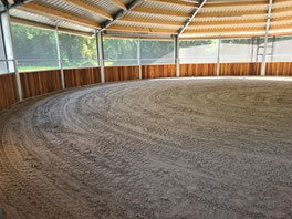 Und falls das Wetter doch mal nicht mitspielt, bieten die 20x40m und 20x60m großen Reithallen und unsere neue 18m Durchmesser große Longier Halle genügend Raum für überdachten Reitunterricht bzw. überdachtes Arbeiten mit seinem Pferd. Die kleine Reithallen befindet sich am Hauptstall, die große Reithalle versetzt neben dem Hauptstall und die Longier Halle hinter dem grünen Stall – für kurze Wege zwischen Stallungen und Reitplätzen.